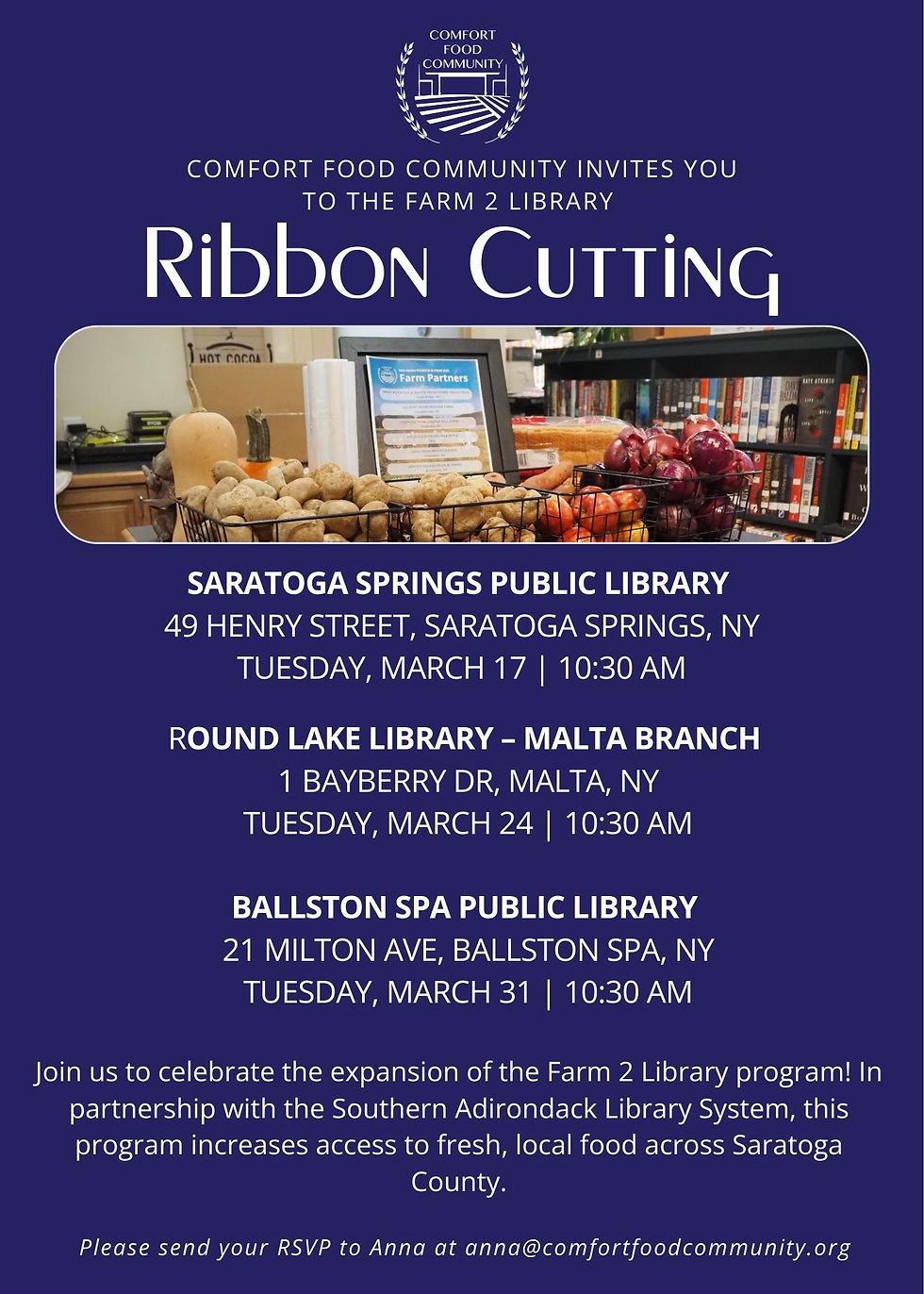 Comfort Food Community (CFC), a nonprofit fighting rural hunger with innovative programming, is expanding its Farm 2 Library program to Saratoga Springs Public Library, Ballston Spa Public Library, and Round Lake Library – Malta Branch, in partnership with Southern Adirondack Library System (SALS). Fresh, nutritious, and local food will be accessible to anyone who needs it starting Wednesday, March 4, 2026. To celebrate this expansion, ribbon cuttings will be held at each new location.